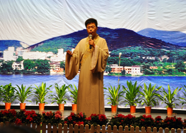 6月19号上午,决赛依然分两场进行。甘泉老师换上了蒙古族特色服装,他宝蓝色的身影、深沉浓情的嗓音获得了评委的一致好评,最终以96.32分的好成绩获三等奖;刘天佑则以一袭灰衫重现当年范仲淹的形象,最后也以95.43分获三等奖。