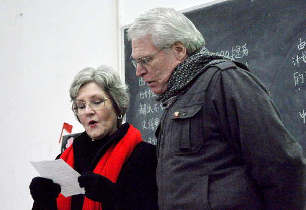 本网讯(记者刘磊 员工记者吴方阳)12月26日,美丽的校园雪后初霁。晚上7点,外语学部在1教112教室为两位即将返美的外教Terry和Gary举行欢送会。当晚,近200名外语学部员工参加了晚会。