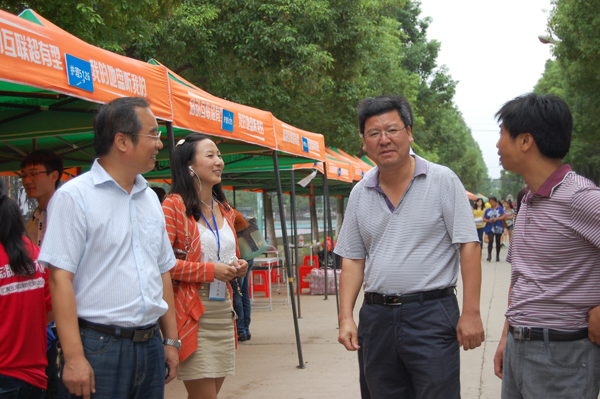 在迎新主干道上,张董事长认真查看了新生入学报到流程图,听取了经理沈光明对迎新工作情况的具体汇报,并提出了可行性建议,向在一线辛勤工作的迎新工作者表示亲切慰问。