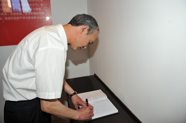 在遗物陈列柜前,专家们深情缅怀三位英烈陈及时、何东旭、方招同学。康灿华教授在纪念馆纪念册上题字“向英雄学习”,并与“10•24”英雄老员工徐彬程、昌子琪合影。