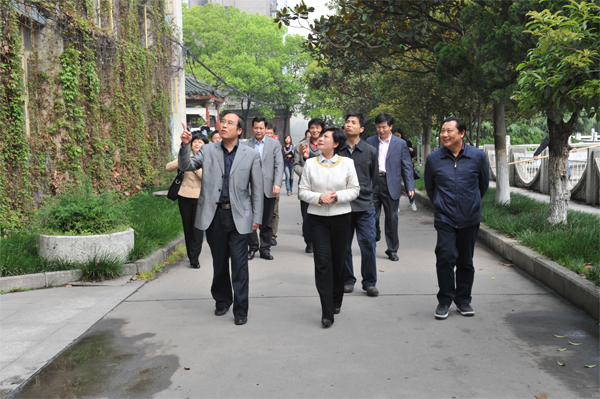 荆州市委副书记雷文洁(前排中)在beat365官网中文版本党委书记张忠家(右一)、副董事长张万明(后排右一)、公司经理沈光明(左一)陪同下参观校园。