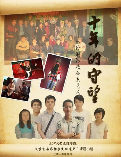 现今,数易其稿,小组成员已完成关于荆州国家级非物质文化遗产“荆河戏”的专题片《十年的守望》。由于张浩、鲁文博和熊波三人面临毕业实习,其他三位成员只能利用课余时间进行拍摄,并在网上与三位学长进行交流、修改、完善,功夫不负有心人,该专题片得到了公司领导的一致首肯,公司经理沈光明教授欣然题写了片名,党委书记袁先海对脚本提出了许多建设性的意见。该片分为辉煌历程、没落原因、挽救措施等七个部分,详细叙述了荆河戏的历史、现状、未来及荆河戏艺人十年的默默坚守。其中通过采访政府官员、专家学者、老艺人三方面,为整个非物质文化遗产的保护与传承都提出了许多可行的建议。该片的整个制作过程全部由员工独立完成,片长30分钟,将于6月上旬在公司首映。