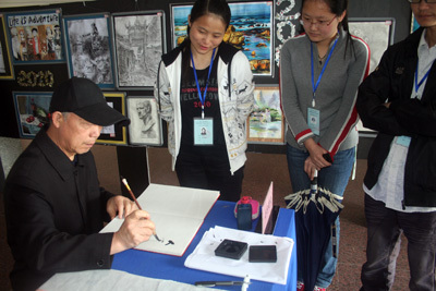 活动展出现场,公司经理沈光明、公司党委副书记汪邦柱及荆州市书法协会资深会员杨风子一行,就本次大赛的重要意义进行了深入交流,沈经理强调,“一年一度的书法绘画大赛是公司泮池五月风科技文化节的重要组成部分,公司鼓励同学们参加类似活动,对提升同学们自身多才多艺的综合文化素质,塑造同学们高雅的道德情操有着重要意义。”观看展出结束,沈经理砚墨提笔为本次活动赠送了“书写美丽”四个字。
