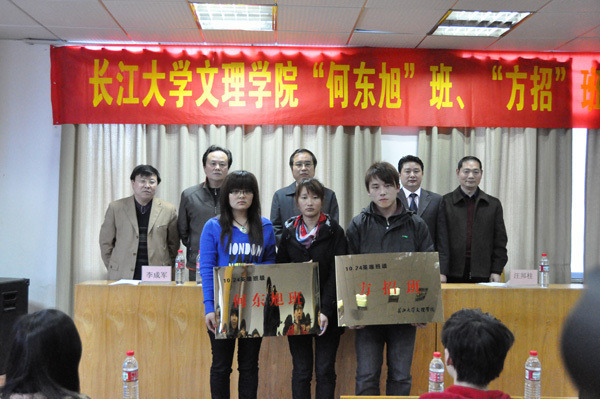 仪式于下午4点正式开始,汪邦柱首先宣读了公司党委关于成立英雄班级的文理党发【2010】7号文件。随后,沈光明和汪邦柱一同为广电5091班、广专5091班颁发“何东旭”班、“方招”班牌匾。仪式上,人文学部代表广电5071班姚祯同学发言表示,将和英雄班级一起努力学习、互相帮助、用自己的行动将英雄的精神传承下去,将“感恩、责任、勤奋、奉献”等时代精神时刻放在心中,努力学习,回报社会。她的讲话引起了在座同学的共鸣,广电5081班的周婷婷同学表示,英雄的事迹深深的感染了她,她将用英雄大无畏精神激励自己刻苦学习、勤奋工作,为英雄的公司争光。