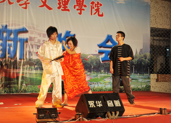 时尚动感的爵士舞《Dancing Queen》拉开了本场晚会的帷幕,音乐所散发的愉悦气氛及灵活多变的舞姿一开场便赢得了新生们的阵阵喝彩。接着的《断点》、《水晶》等一系列耳熟能详的歌曲为晚会营造了一层温馨浪漫的气氛,让新生们燥热的心情也顿时凉爽了不少。话剧《江湖》和街舞《Style》则再次引爆了员工们的热情,将整场晚会气氛推向了高潮。晚会过程中的互动环节,新生们踊跃参与,与舞蹈演员切磋舞技、pk歌曲,真实精彩的表演赢得了观众的掌声阵阵。随后由曲艺协会带来小品《迎新风波》,其演员生动的表演、幽默的语言真实再现了迎新现场的小插曲。晚会最动人的环节是公司为三位同是9月6号生日的09级新生庆生,来自英语5092班的易慧、罗军和会计电算化5091班的汪胜三位同学当晚收到了一份特殊的生日礼物——公司学工处为他们精心准备的生日祝福,这一幕也让不少远离家乡的新生流下了感动的泪水,整场晚会在温馨的《生日快乐歌》中圆满落幕。