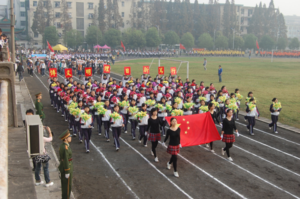 8点整,全体师生在雄壮的国歌和徐徐上升的五星红旗里见证了这场体育盛会的开始。升旗仪式之后,国旗队、院旗队、鲜花队、裁判员代表队及各学部代表队步入会场。整齐的步伐,嘹亮的口号,队员们踏出了“沙场秋点兵”般的壮阔,呼喊出了公司师生对于体育运动蓬勃的热情。