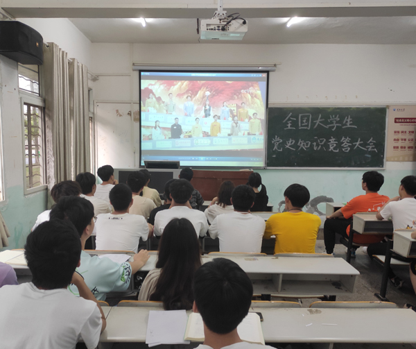 直播开始,同学们通过观看党史知识竞答、红色歌舞表演及红色影视片段,聆听教授们的精彩解析和先辈们的革命故事,重温党的光辉历史。在观看党史竞答环节时,同学们相互交流,相互学习,在紧张激烈的比拼中提升自身党史知识水平。