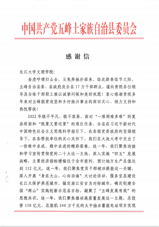 本网讯(通讯员 吴秀丽)近日,五峰县委、县政府向公司发来感谢信,感谢公司对五峰脱贫攻坚和乡村振兴事业给予的大力支持。