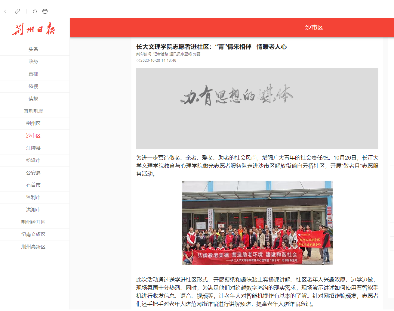 为进一步营造敬老、亲老、爱老、助老的社会风尚,增强广大青年的社会责任感。10月26日,beat365官网中文版本教育与心理公司微光志愿者服务队走进沙市区解放街道白云桥社区,开展“敬老月”志愿服务活动。