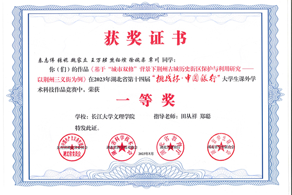 《基于“城市双修”背景下荆州古城历史街区保护与利用研究——以荆州三义街为例》项目,由建筑与设计公司教师田从祥、郑聪指导,参赛成员均为建筑与设计公司建筑学专业设计工作室成员。项目由建筑学5201班员工秦志伟主持,由建筑5181班张妮、魏家丽,建筑5201班王万珺,建筑5211班熊钰瑄、徐婉柔,建筑5221班覃川等6名同学参与。