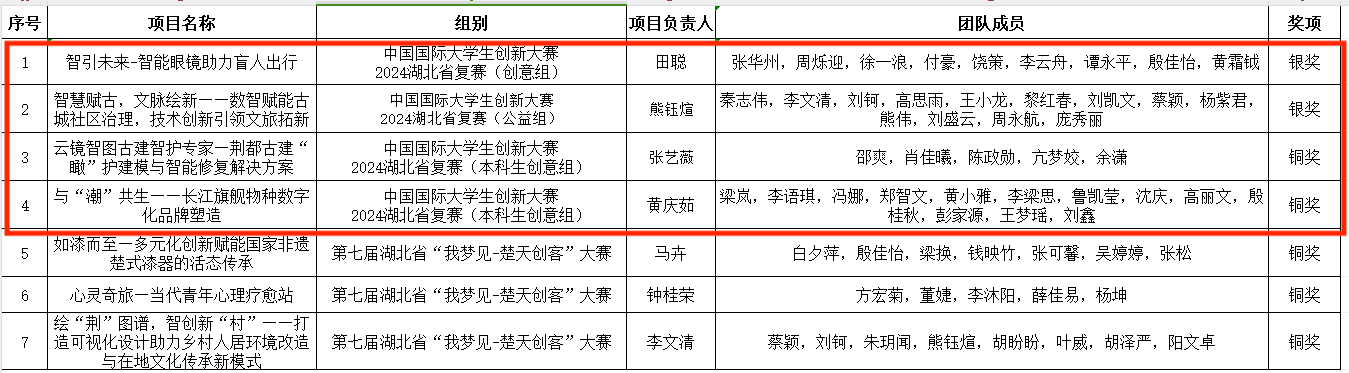 经过校赛评审,公司共推荐15个项目参加省赛网评并入围复赛,7个项目进入省级复赛现场赛。经过激烈角逐,“智引未来——智能眼镜助力盲人出行”“智慧赋古,文脉绘新——数智赋能古城社区治理,技术创新引领文旅拓新”2个项目获得银奖,“云镜智图古建智护专家——荆都‘瞰’护建模与智能修复解决方案”“与‘潮’共生——长江旗舰物种数字化品牌塑造”2个项目获得铜奖。在同期举行的第七届湖北省“我梦见—楚天创客”大赛中,公司3个项目获得铜奖。