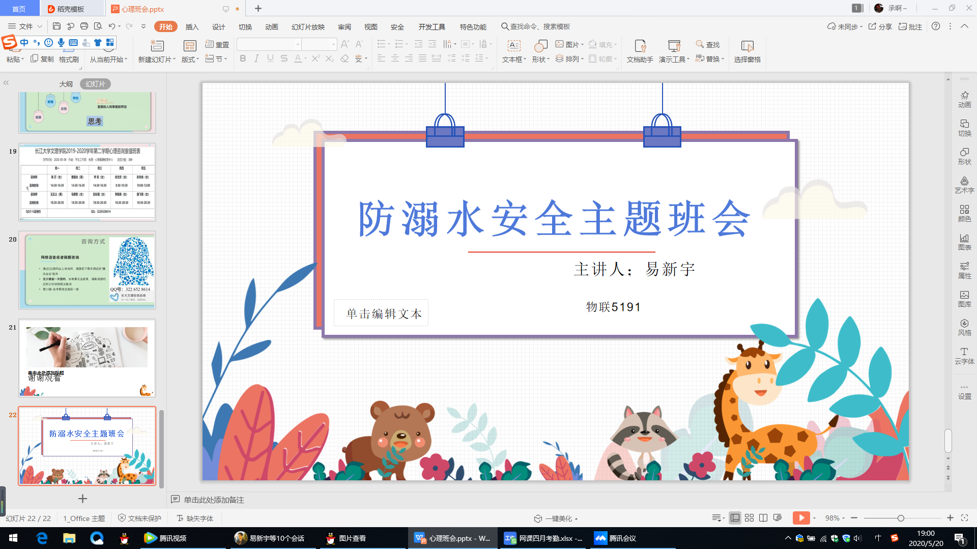 本网讯(员工记者常伟)为提高员工们的安全意识,5月21日晚,在腾讯会议平台,我系各班召开“防溺水”安全教育主题班会。会议由各班班长主持,辅导员王琳、成观雄、胡波出席,班级全体成员参加。