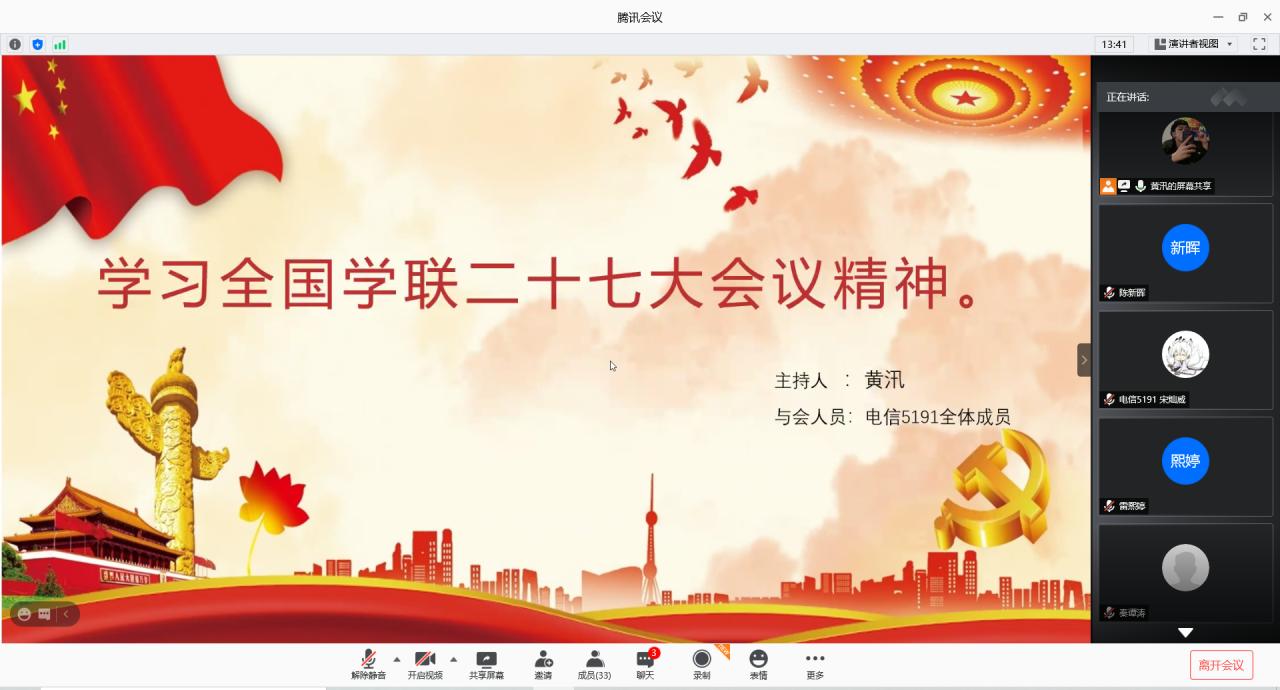 本网讯(员工记者 漆丽华)为继承和发扬中国青年运动的光荣传统,志高存远、脚踏实地,不断成长为能够担当民族复兴大任的时代新人。9月17日晚,在腾讯会议平台,我系各班组织开展“学习全国学联二十七大会议精神”团课,各班团支书主持,辅导员成观雄、燕梦蝶出席,班级全体成员参加。