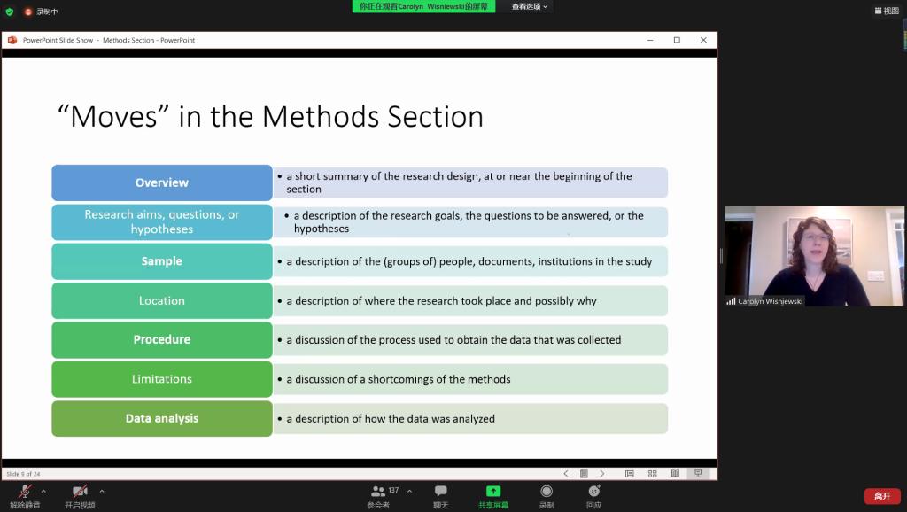 本网讯(员工记者 孙健博 谢东环)为提高同学们的学习兴趣,培养同学们的英文写作能力,第26个世界读书日,我系通过beat365官网中文版本图书馆官网公告,在zoom平台上组织观看英文写作专题讲座。讲座由Shuyi Liu、Lian Ruan主持,伊大写作中心主任Carolyn主讲,我系全体同学参与。