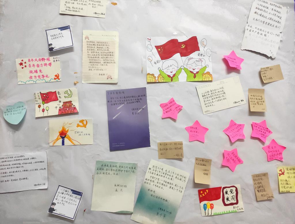活动期间,同学们通过贺卡、绘画、文章等形式表达自己对党的认识和革命精神的理解。用最真挚亲切的语言祝福党的百年华诞,用最生动形象的绘画记录党的伟大事件,平淡质朴的文章带我们回忆党的每一时刻。一幅幅作品,无一不体现出同学们的用心和对此次活动的重视。其中电信5201班谢东环为党写了一封信,她表示,在党的领导下家乡贵州有了很大变化,也是在党的带领下中国可以很快控制住疫情,今年是建党100周年,衷心的祝福党,希望党越来越好。