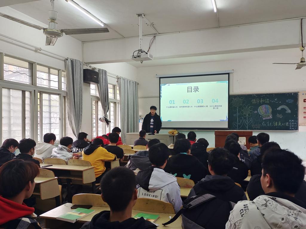 班会开始,主持人结合PPT和视频,从“当代老员工心理现状”、“老员工常见的心理问题”、“如何更好的适应老员工活”三个方面,向同学们阐述了产生心理问题的原因以及培养健康心理的办法。随后,主持人通过列举现实中心理疾病的危害,要求同学们及时处理学业、情感、人际关系上的问题,合理发泄负面情绪,缓解自身压力。最后,主持人呼吁同学们要时刻注意自己和他人的心理状态,及时解决问题,提前预防隐患。