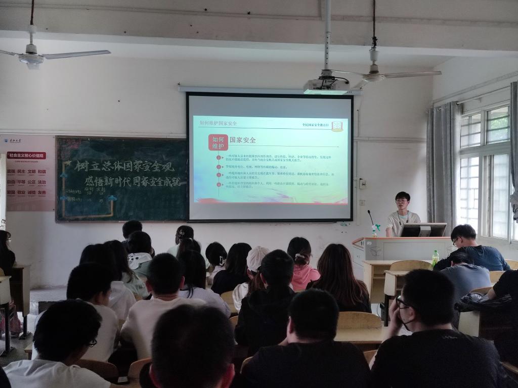 团课开始,主持人结合PPT和关于国家安全教育的视频,围绕“国家安全的重要意义”、“国家安全的基本知识”、“国家安全的总体形势”等方面展开讲解,提高同学们对维护国家安全的重视,培养同学们的国家安全意识。随后,主持人通过邀请同学们诵读《宪法》、《国家安全法》、《生物安全法》等节选,向同学们普及了有关国家安全的法律法规,并对“如何维护国家安全?”这一问题组织同学们进行讨论。他总结到:“国家安全,有你有我,自觉维护国家安全,是每个公民应尽的责任,也是每个青年学子应尽的义务。”