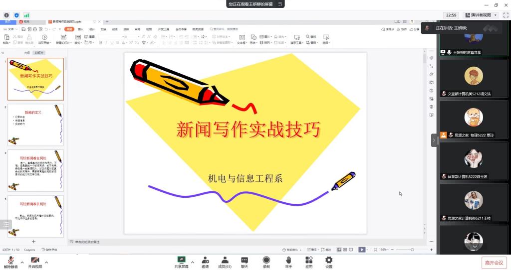 本网讯(员工记者 余绍文)11月11日中午,我系通过腾讯会议开展线上新闻稿撰写培训会,培训会由辅导员王妍柳主讲,第十八届团学组织全体成员参加。
