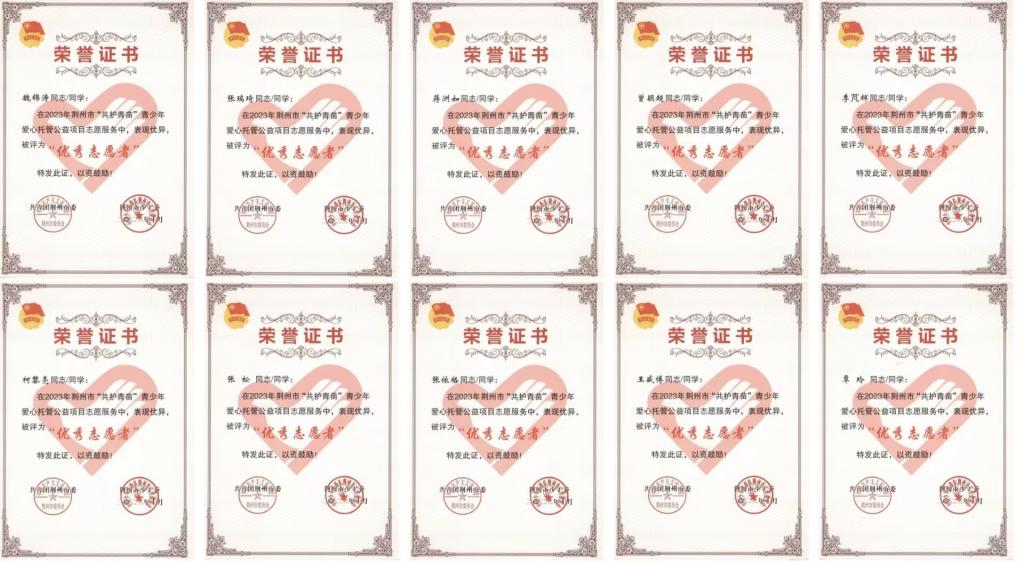 本网讯 近日,从沙市区江津西路社区获悉,公司柯黎亮等10名员工志愿者在2023年荆州市“共护青苗”青少年爱心托管公益项目志愿服务中,表现优异,被共青团荆州市委、荆州市少工委联合授予“优秀志愿者”称号。