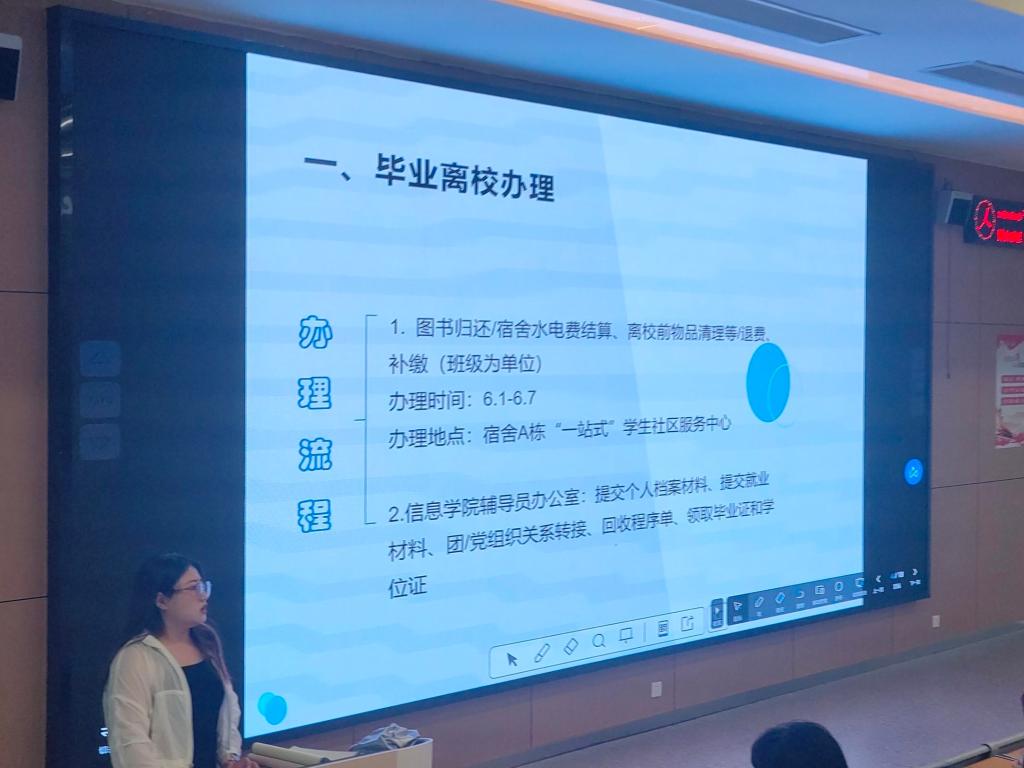 各辅导员围绕毕业离校办理,对各毕业生可能存在的问题和疑惑作出解释,给出建议,让大家树立榜样、严守公德,确保毕业生平安有序离校,推动毕业生离校工作安全、文明、和谐、稳定进行。