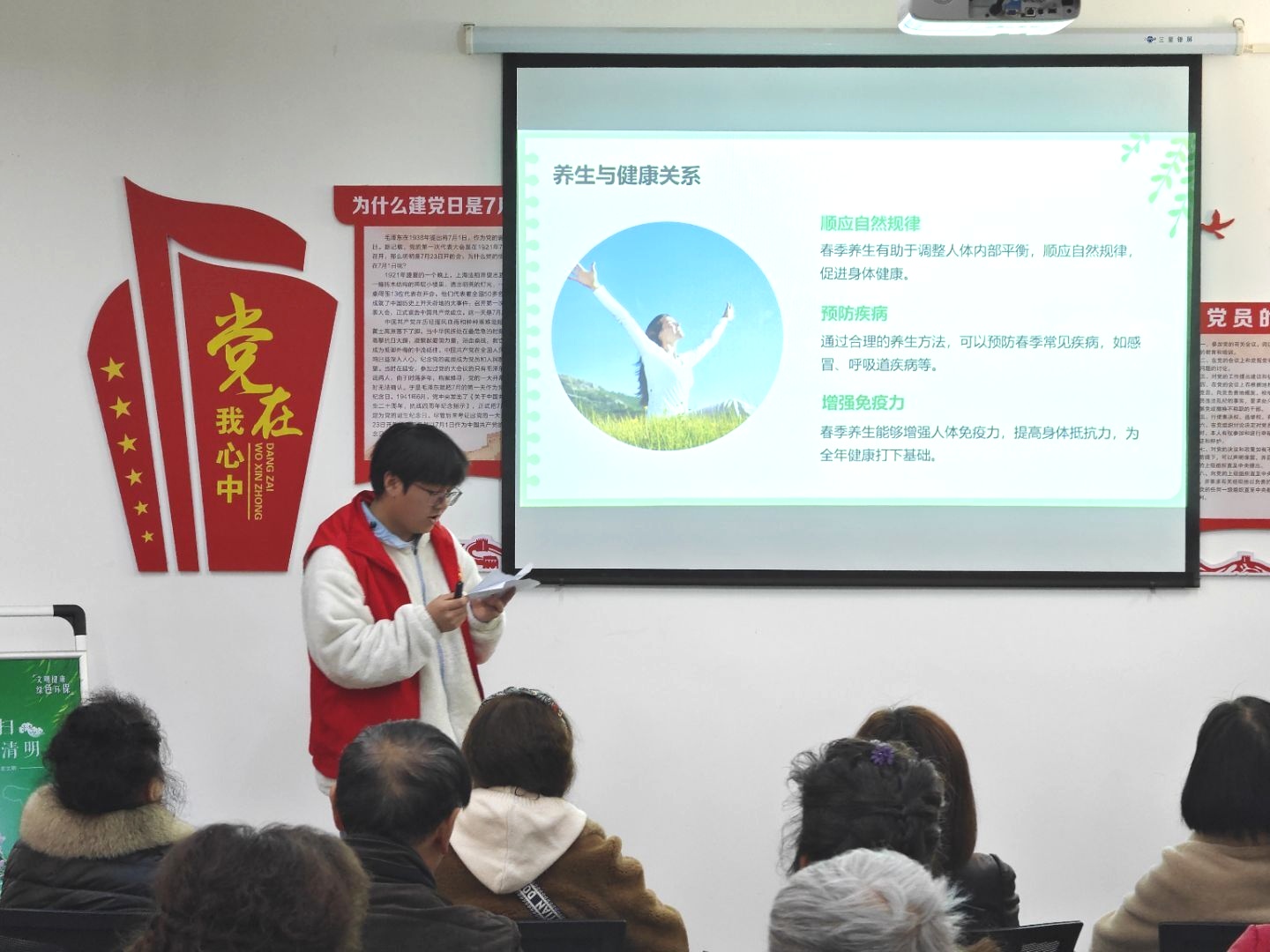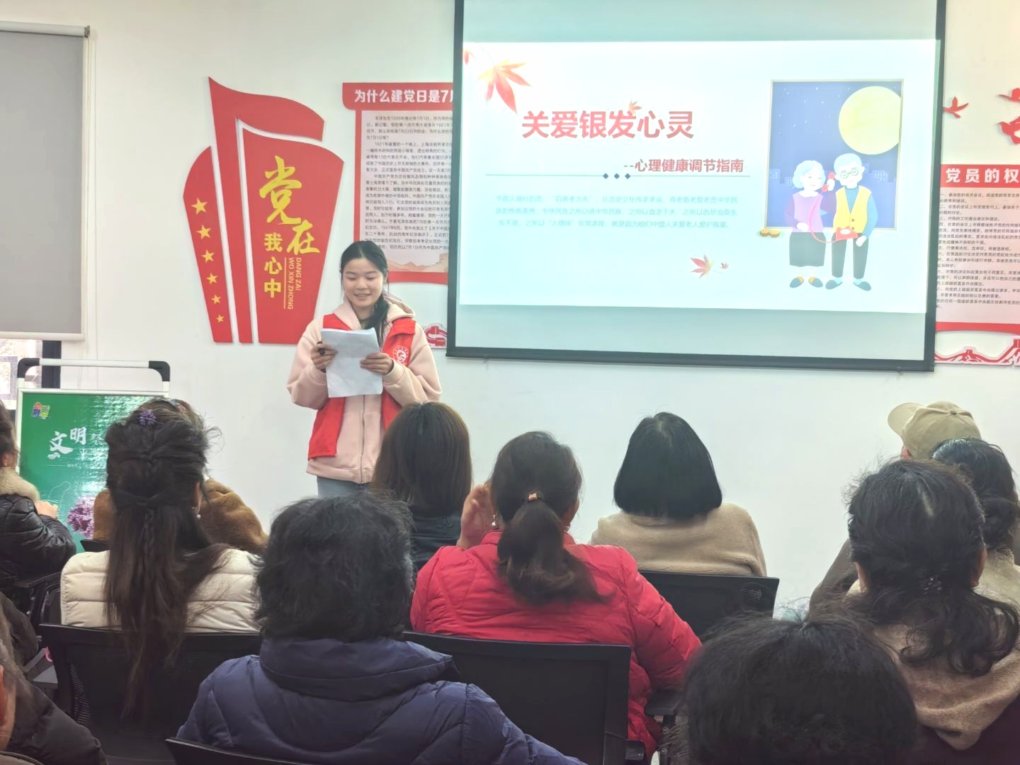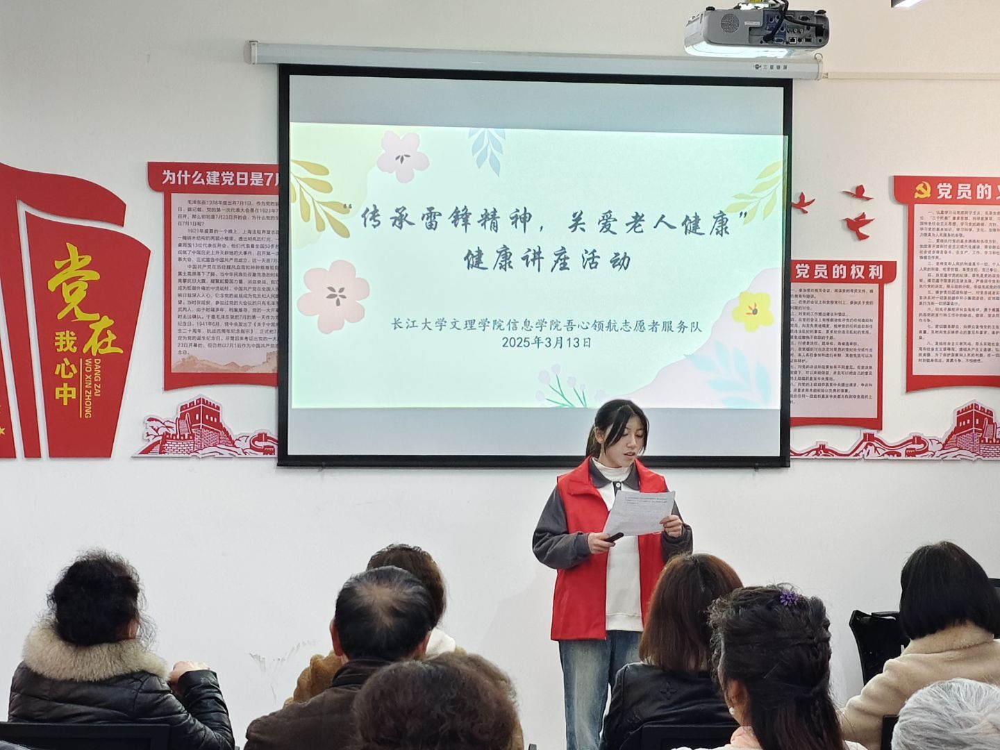 活动开始,主持人刘秀同学致开幕词,公司员工会3名志愿者代表依次上台进行宣讲。志愿者谭杰同学围绕“春季老年人养生”这一主题,从饮食、运动、疾病预防三个方面,为老人们详细讲解了如何在万物复苏的春季保持身体健康,他建议老人们春季饮食要清淡,多吃新鲜蔬果,并给老人们推荐了适合他们的春季运动方式,如太极拳、散步等,还贴心地提醒老人们要注意预防春季常见疾病;王麒瑞同学则将目光聚焦在老年人居家安全问题上,他通过生动的案例和现场演示,向老人们科普了防跌倒技巧,并重点讲解了规范用电、用火、用水的重要性,提醒老人们要提高安全意识,避免居家生活中受到不必要的伤害;陈媛媛同学从心理健康的角度为老人们讲解了如何调节情绪、保持乐观心态,她列举了老年人常见的心理问题,如孤独感、焦虑感等,并提供了切实可行的解决方法,鼓励老人们积极面对生活,保持身心健康。期间,志愿者们和老人们热情沟通,并耐心解答他们的疑惑。活动结束后,大家一起合影留念,共同记录这温馨时刻。