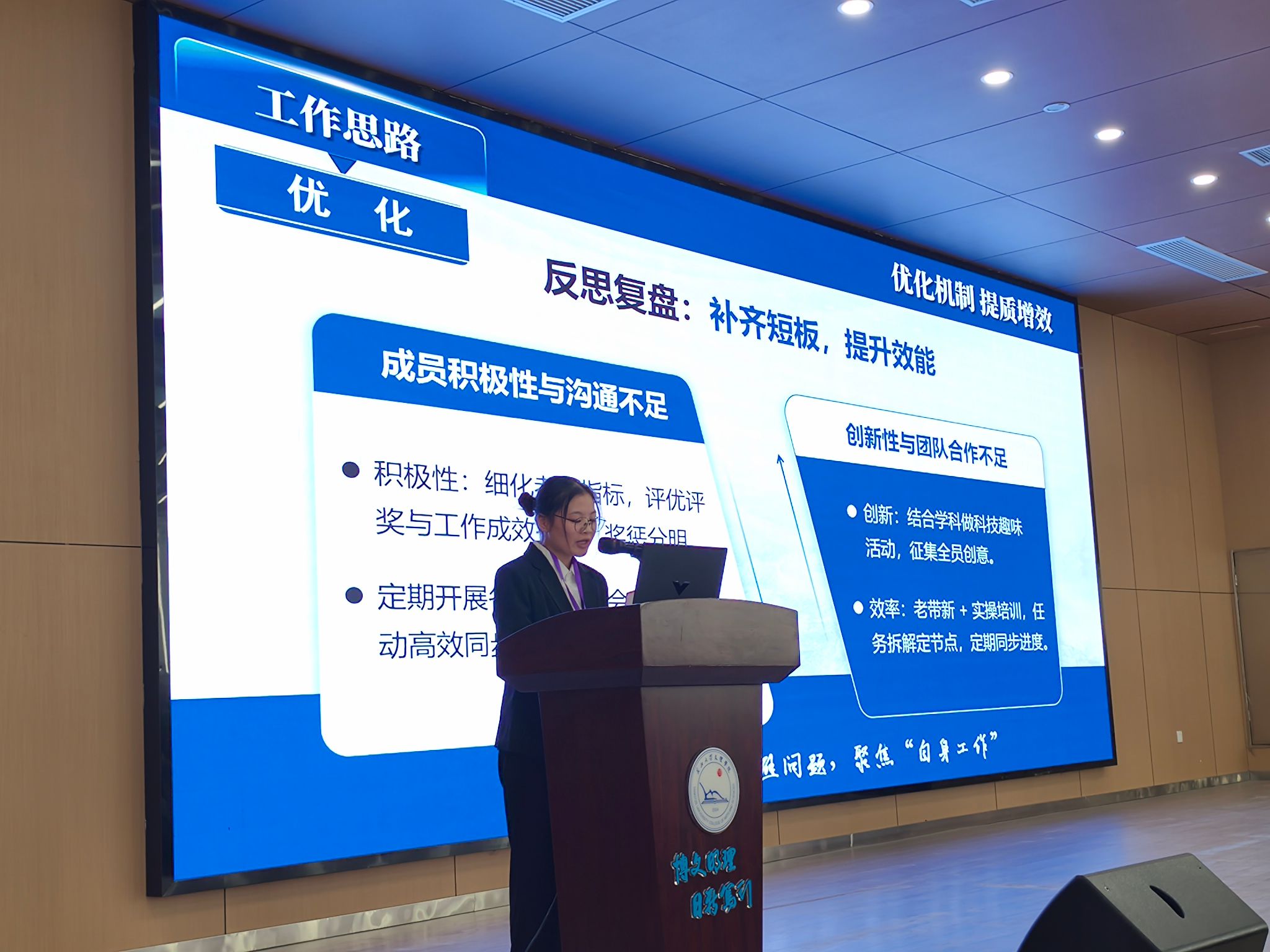 表彰结束后,各部门负责人依次做本年度工作汇报,深入剖析成果与不足,并提出切实可行的改进方案。员工会主席团代表邓书婷作年度工作报告。她强调,员工干部须始终牢记服务宗旨,聚焦同学需求,持续优化工作机制;未来将着力从机制完善、活动创新、服务提质三方面深化探索,让团学工作更有温度、更具实效。