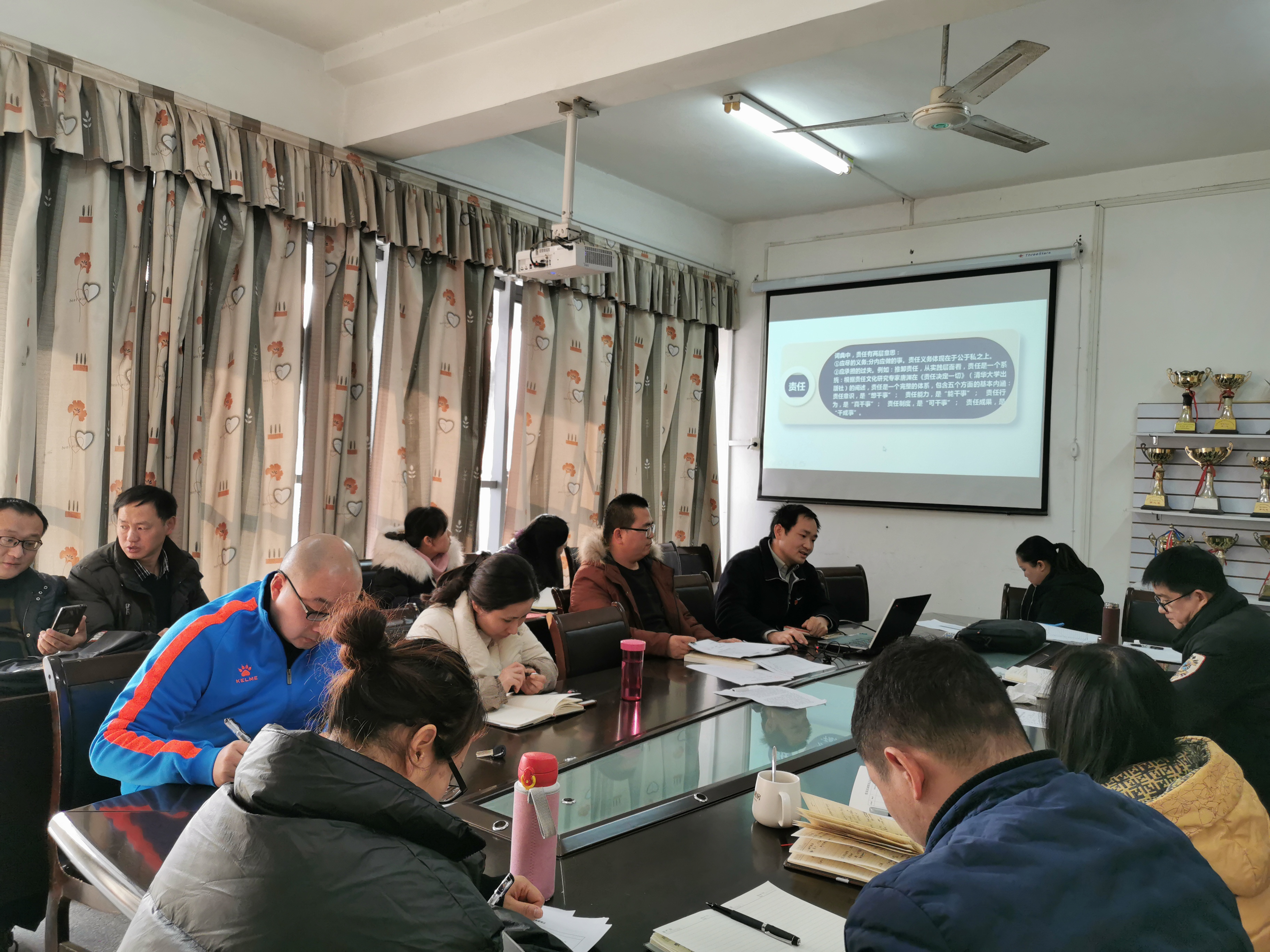 首先在公司工作专题学习部分,系主任付兵带领大家回顾了2019年教务、教学及学工相关工作,对立项重大课题及系部科研状况良好的老师进行了表扬,对员工工作付出巨大努力的老师予以肯定,并预祝全体老师新年快乐。