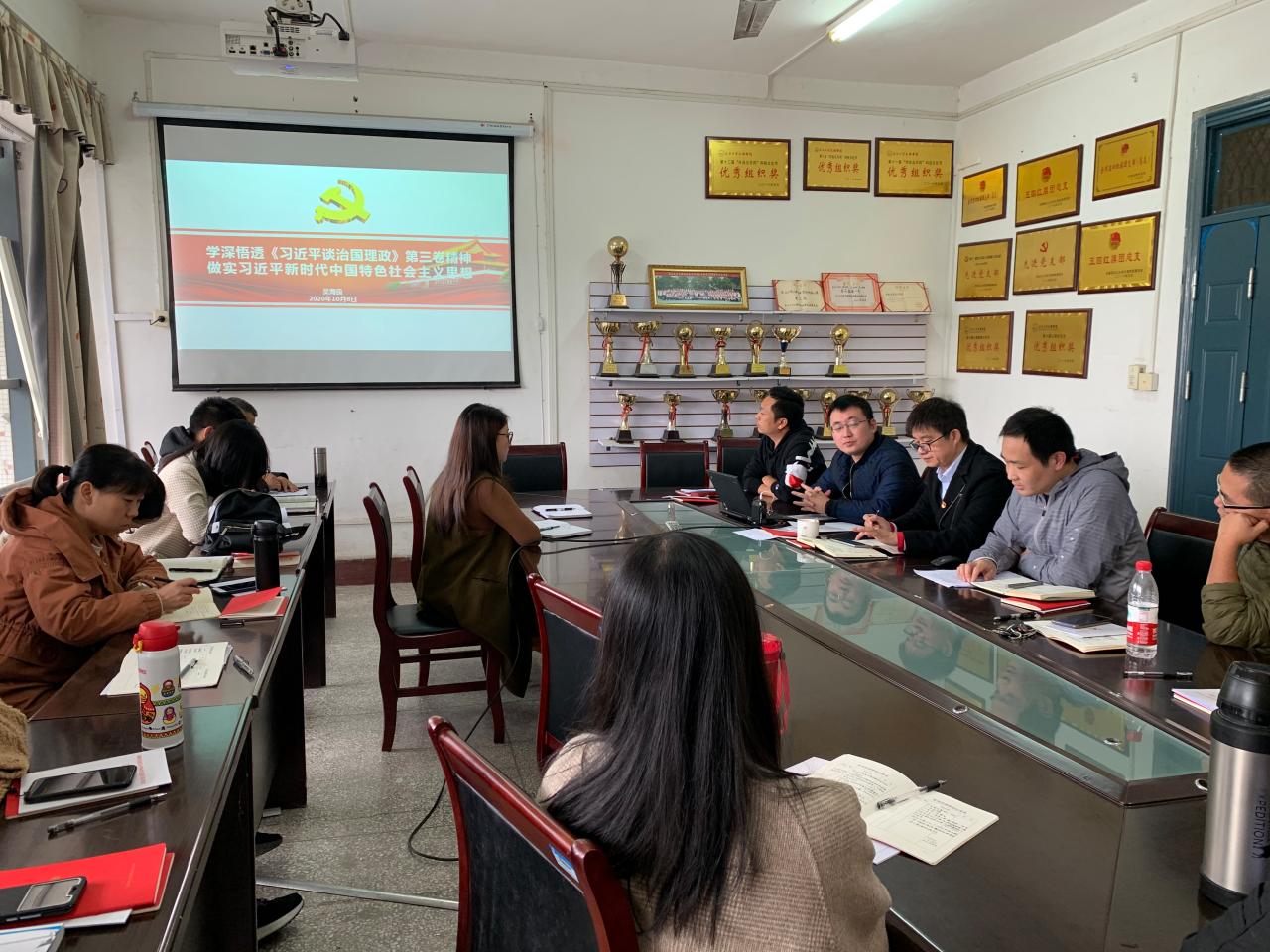 首先在支部书记的带领下,所有老师重温入党誓词,然后政治学习阶段,由教工党支部书记呙明辉带领大家集体学习了习近平主持召开中央全面深化改革委员会第十五次会议强调推动更深层次改革实行更高水平开放为构建新发展格局提供强大动力,习近平在纪念中国人民抗日战争暨世界反法西斯战争胜利75周年座谈会上的讲话,习近平在全国抗击新冠肺炎疫情表彰大会上的讲话等10项内容。