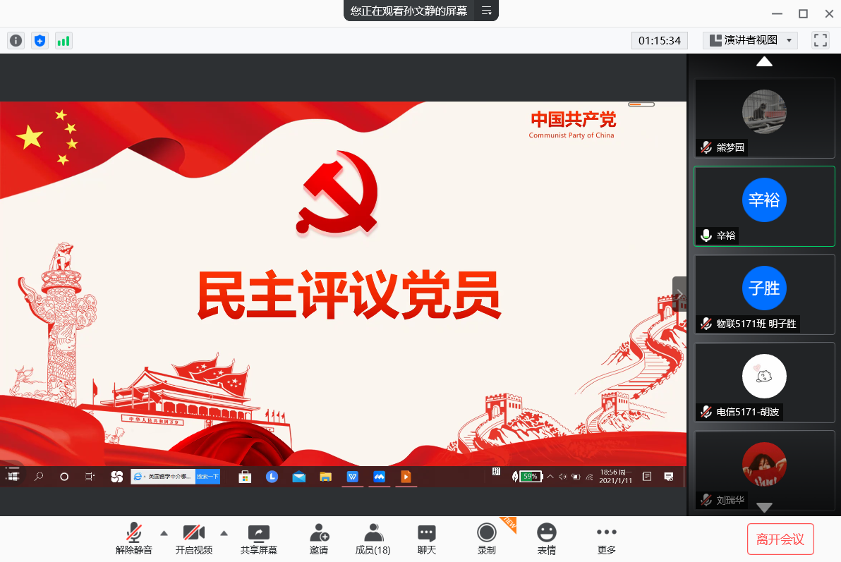 本网讯(员工记者 常伟)1月11日晚,在腾讯会议平台,我系员工党支部开展线上12月份政治学习、“支部主题党日”活动和2020年专题组织生活会暨民主评议党员会议。支部全体党员参加。