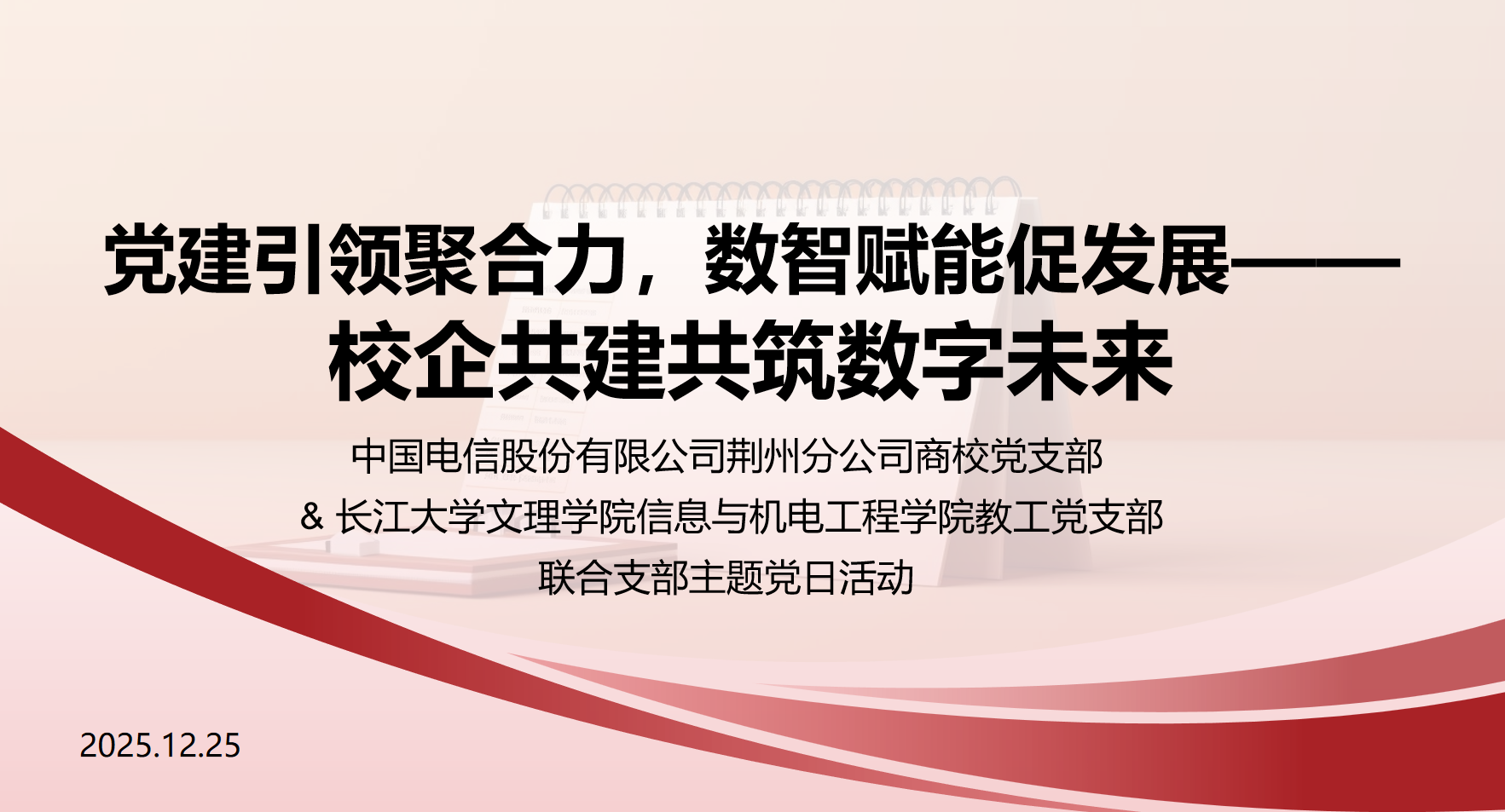 本网讯(通讯员 呙明辉/文 肖青青/摄)12月25日下午,信息与机电工程公司教工党支部与中国电信股份有限公司荆州分公司商公司党支部联合开展“党建引领聚合力,校企共建筑未来”主题党日活动。双方通过经验分享、座谈研讨、实地参观等形式,共同探索党建与业务深度融合新路径,携手服务地方数字经济发展。
