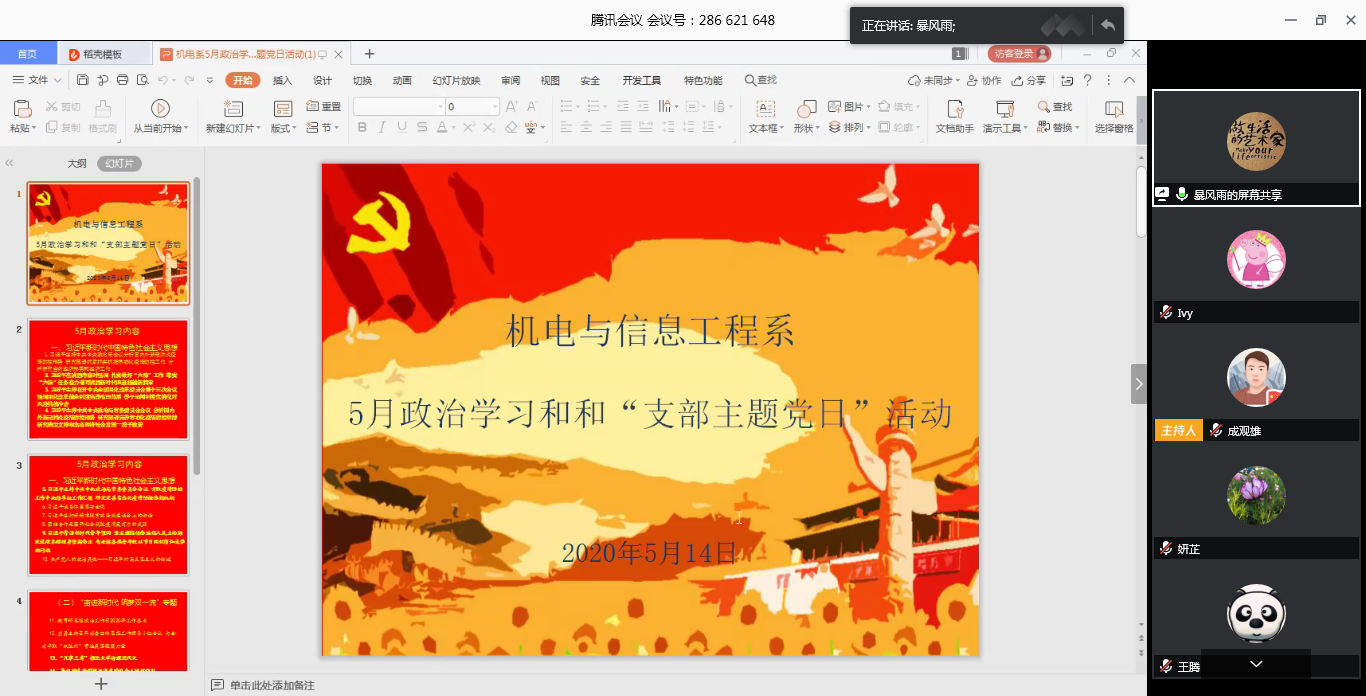 本网讯(通讯员 成观雄)5月14日晚上7点,我系教工党支部在腾讯会议平台开展5月份政治学习和“支部主题党日”活动。会议由教工党支部书记呙明辉主持。