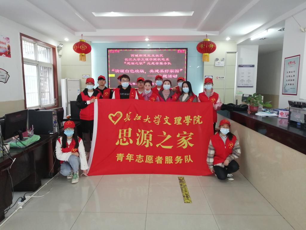 (员工记者 周晶晶 高佳佳)为环保理念深入人心,增强同学对环保的认识,3月12日植树节当天,我系“思源之家”志愿者服务队联合荆州市西城街道民主社区于荆州古城附近开展以“拒绝白色垃圾,共建美好家园”为主题的垃圾清扫活动。我系志愿者服务队全体成员参加。