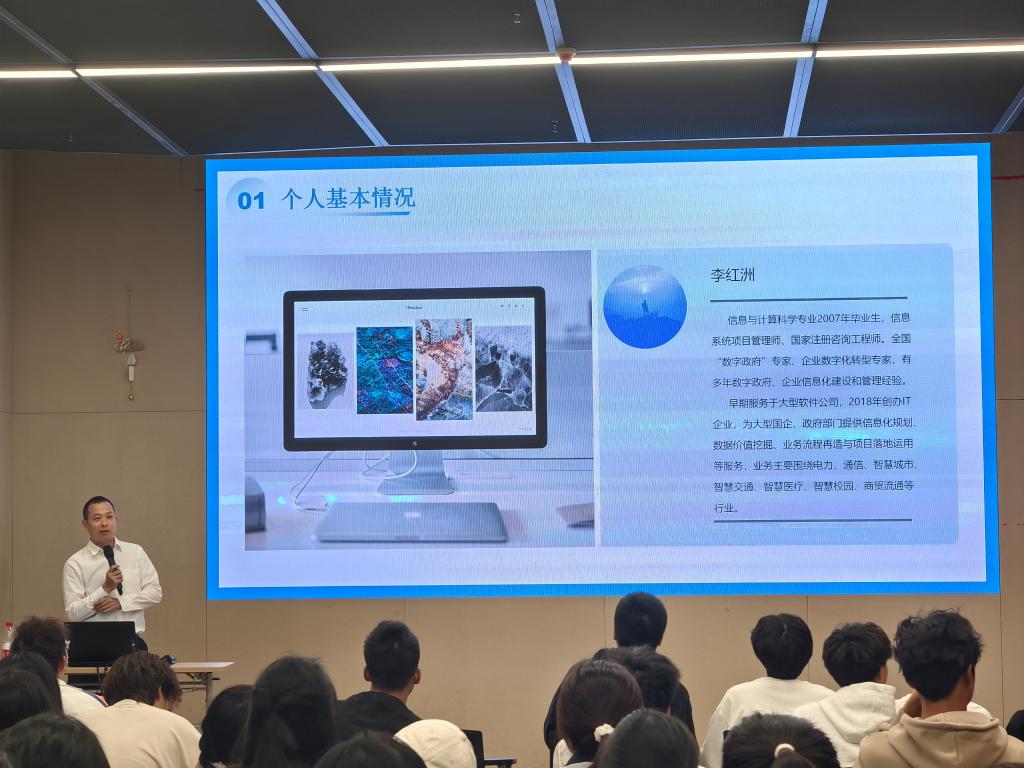 会议伊始,吴海良依次介绍了2位分享员工:信息与计算科学专业2007届员工、广州市智进信息科技有限公司总经理、信息系统项目管理师、国家注册咨询工程师——李红洲;计算机应用技术专业2007届员工、融粤汽车集团总经理——张磊。