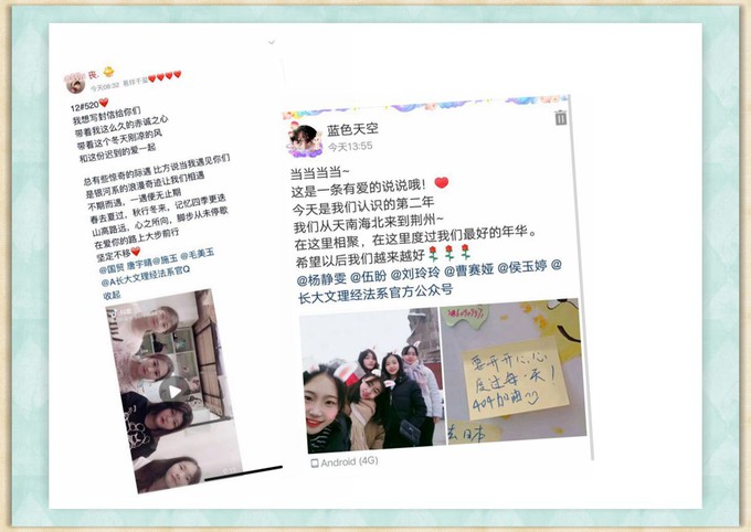11月8日至14日,经法系“短信传情”活动现场异常火爆。同学们用手机编辑对一段室友关心和祝福的文字或图片发送到自己的QQ空间或朋友圈告白自己的室友,吐露自己内心的想法,释放内心深藏的情感,增进寝室成员感情,让宿舍氛围更加和谐愉快,让室友关系更加融洽。在“传情”成功之后,同学们跟玩偶熊热情相拥表示友好和感谢,并现场转动“幸运大转盘”,领取一份属于自己的活动纪念品。“我是一个不善表达的人,通过这个活动,我把珍藏内心深处很久的话跟室友‘表白’了,说完后仿佛让我们彼此的心更近了。我觉得活动非常有意义。”国贸5171班杨晓旭同学说。