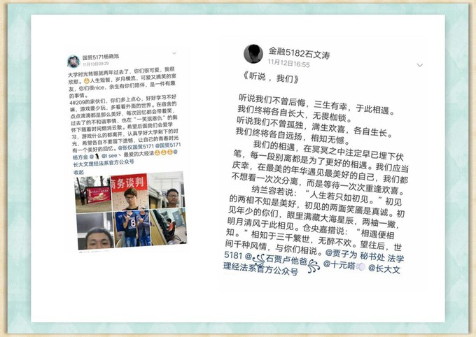 11月15日至18日,经法系心灵驿站的员工干部们收集整理了同学们的投稿,经过整理共收到来自全系106个寝室的134条告白短信。11月19日,经过最终投票评选,12条精品告白短信脱颖而出。至此,由我系心灵驿站特开展的“心理阳光进寝室”之“短信传情”活动圆满结束。