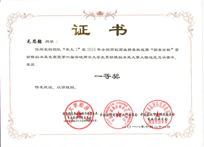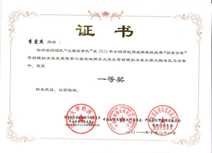 全国高校商业精英挑战赛“国泰安杯”营销模拟决策竞赛暨第六届海峡两岸老员工营销模拟决策大赛大陆地区总决赛 一等奖