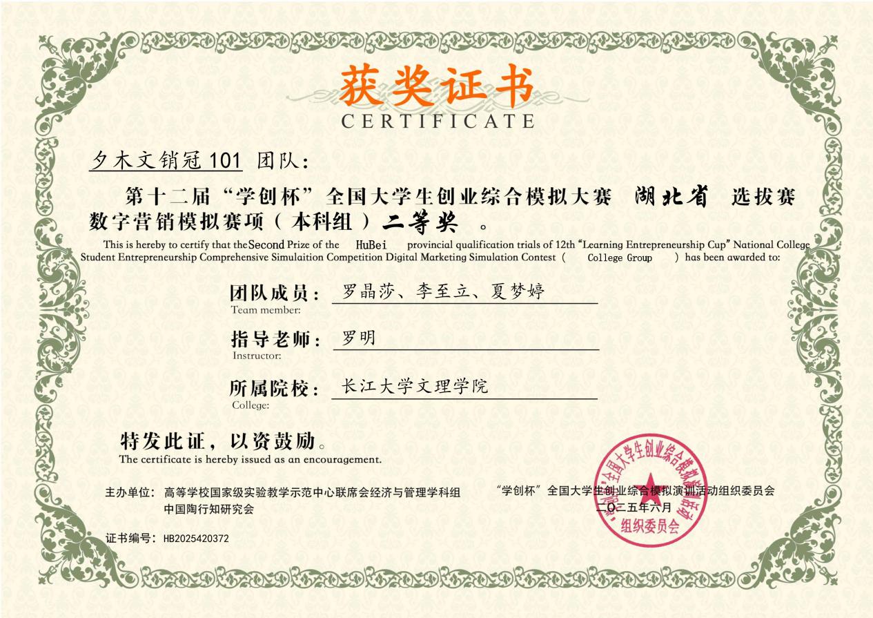 第十二届“学创杯”全国老员工创业综合模拟大赛湖北省选拔赛数字营销模拟赛项(本科组)二等奖