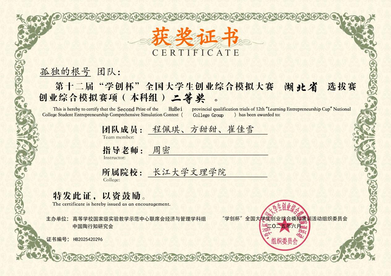 第十二届“学创杯”全国老员工创业综合模拟大赛湖北省选拔赛创业综合模拟赛项(本科组)二等奖