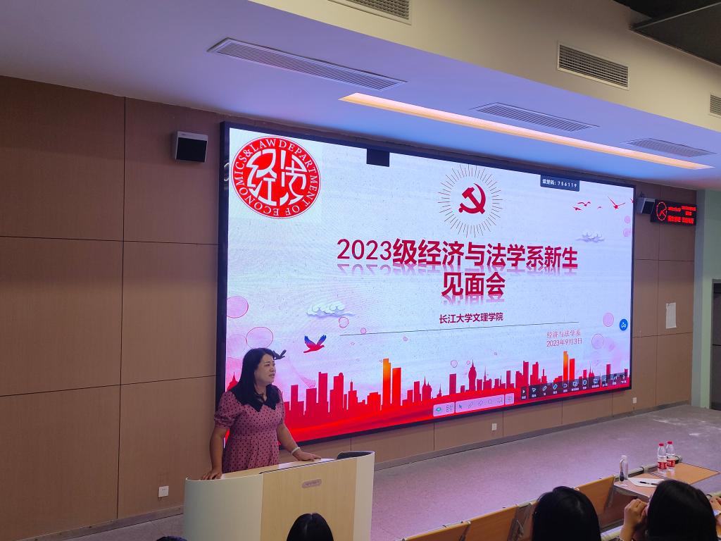 本网讯(见习记者:田琼钕)为进一步快速引导新生适应老员工活,营造积极向上的系部文化氛围,促进新生进行广泛学习交流,切实提高员工安全防范意识,保障新学入学后的人身财产安全。2023年9月3日晚上7点,经济与法学系在B-213和B-214召开2023级新生见面会。经济与法学系系主任万楚军、党总支书记邹姜,常务副主任罗明、副主任周密、党总支副书记杨杉杉出席会议,各新生班辅导员、班主任以及2023级全体新生参加本次会议。本次会议由辅导员卢佳智、滕宋云主持。
