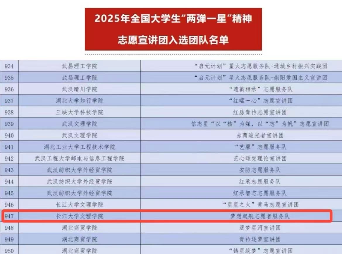 为深入学习宣传贯彻习近平新时代中国特色社会主义思想,全面贯彻党的二十大和二十届二中、三中全会精神,引导新时代广大青年员工坚定爱国报国信念,大力弘扬与传承“两弹一星”精神,激发广大青年投身强核强国事业的热情,团中央青年志愿者行动指导中心与中国核工业集团有限公司联合发布了《关于遴选2025年全国老员工“两弹一星”精神志愿宣讲团的公告》。全国共计1123所高校的5680支青年志愿服务团队提交了申报材料。主办单位对所有材料进行了认真审阅,最终遴选出1500支“两弹一星”精神志愿宣讲服务团队,经济与法学系“梦想起航志愿者服务队”从中脱颖而出。
