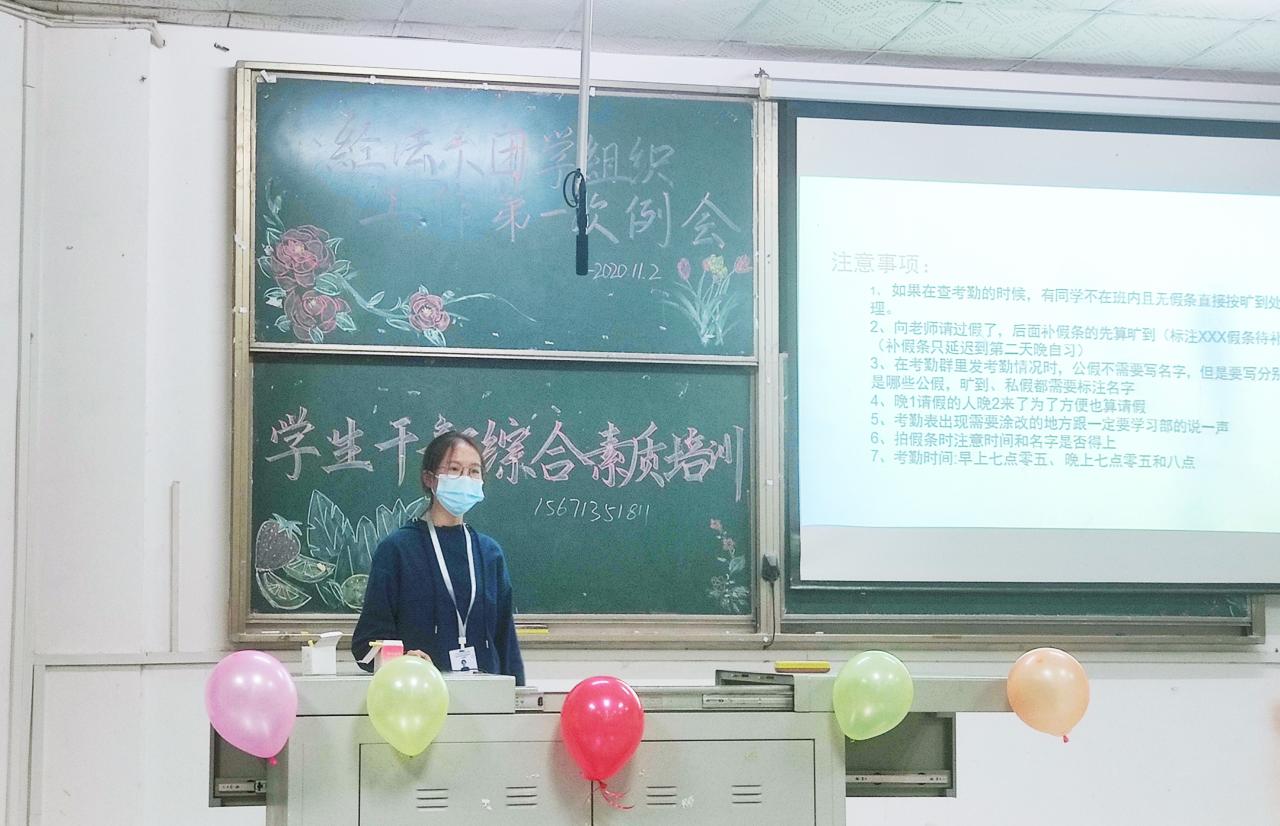 本网讯(通讯员:郑驰 邓安琪)11月2日晚,经法系于4教200召开员工干部综合素质培训大会暨经法系第十六届团学组织工作第一次例会。与会人员有经法系19级、20级所有员工干部及志愿者服务队全体成员。会议邀请到党总支副书记杨杉杉老师、辅导员卢佳智老师、滕宋云老师参会。大会由秘书处部长谭舒文主持。