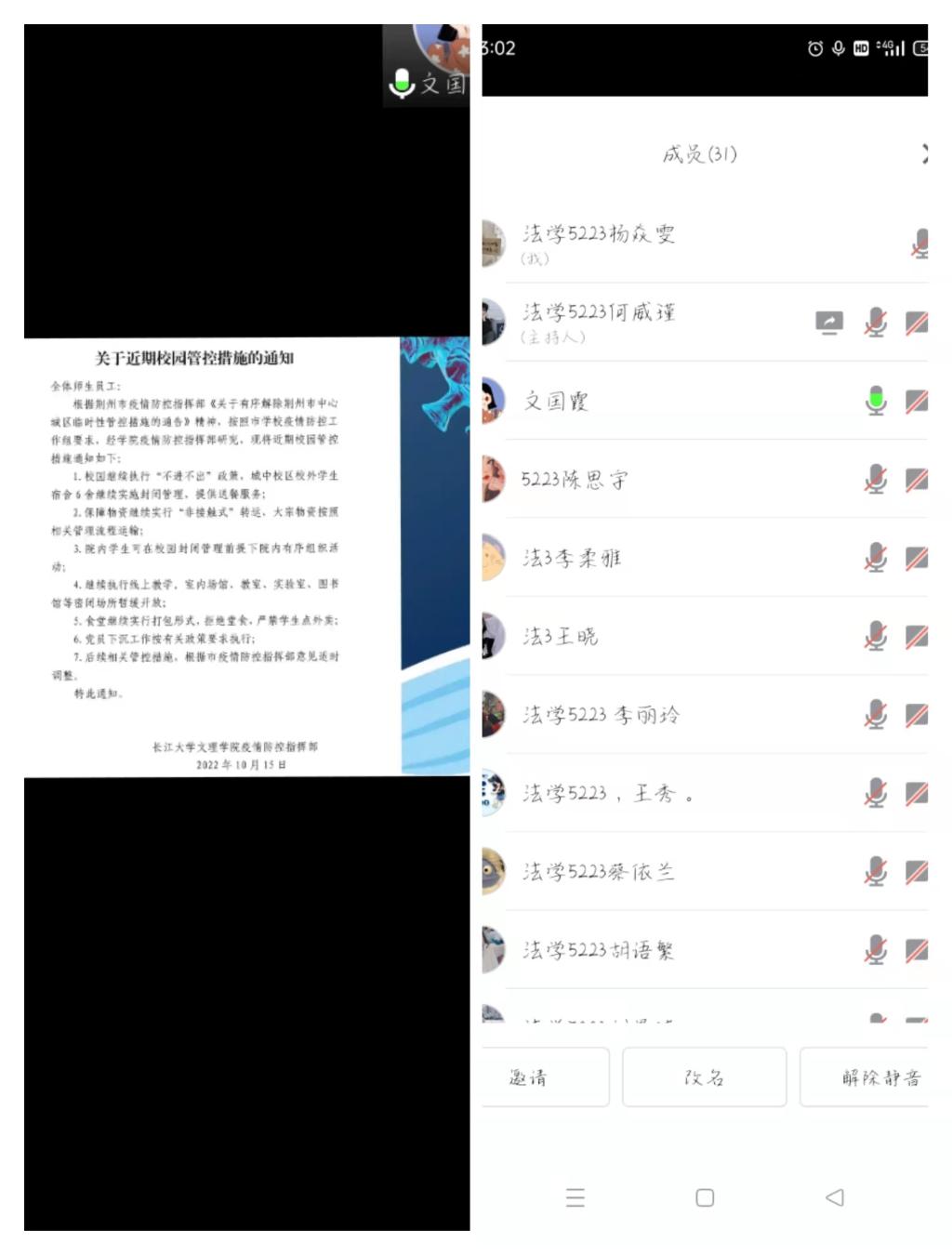 本网讯(见习记者:李欣怡 田琼钕 夏雪飞)根据公司疫情防控工作会议要求,更好地配合防疫工作的开展,经法系各班于10月15日召开“同心战疫,共克时艰”线上主题班会,为后续工作做好保障。