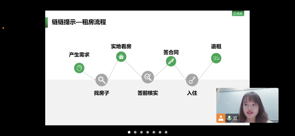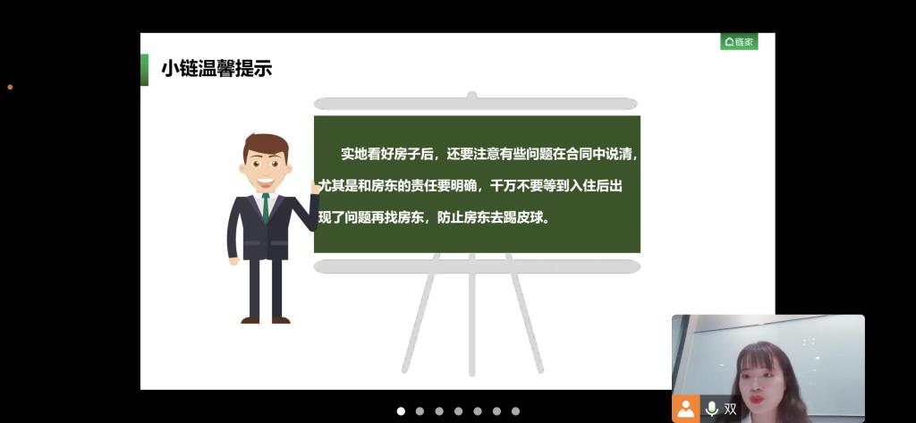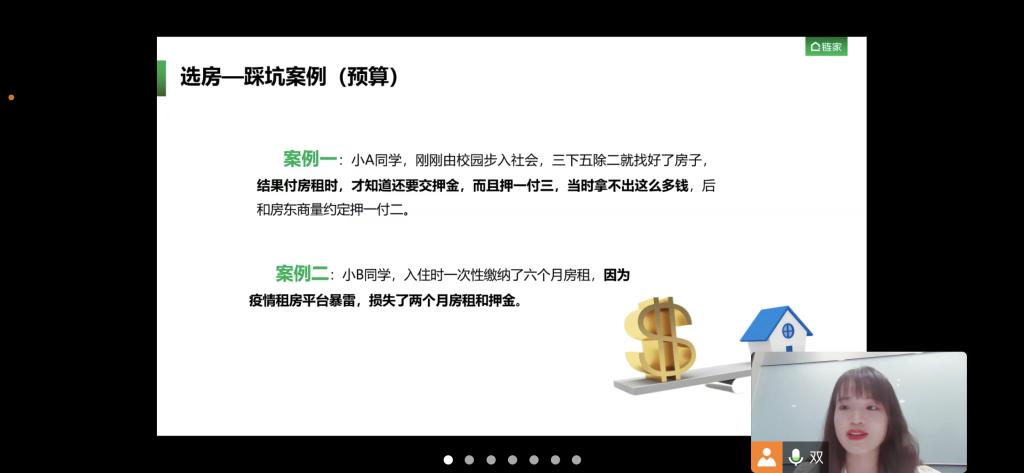 首先,史双双经理向同学们说明租房的正确流程,并结合近年来房屋租赁市场存在的问题,深入浅出地向员工们介绍了房屋租赁过程中常见的虚假房源骗取租金、低价诱惑、巧立名目乱收费、二房东克扣押金等九大陷阱。其次,史双双经理结合选房踩坑案例,警醒老员工一定要在租房前掌握租房过程中的一些专业名词。史经理温馨提示毕业生们:要实地看好房子后,注意合同内容,尤其是和房东的责任要明确,千万不要等入住后出现了问题再找房东,防止房东去踢皮球。最后,史双双经理也通过此次线上讲座为毕业生介绍了链家公司的企业文化和校园招聘,为毕业生提供了实习就业岗位,进一步加强了校企间的合作。