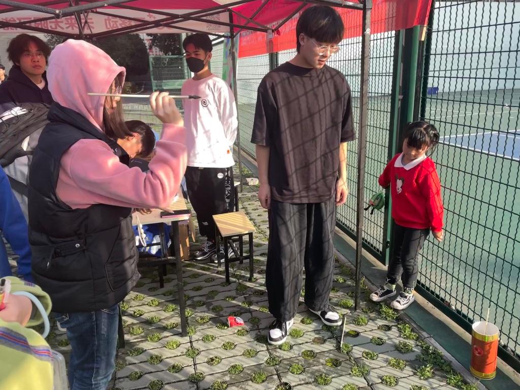 在“载福予人”活动中,同学们可以选择回答一份问题,答对一定数量的问题后可以在不透明箱子里抽取一张卡片,在卡片上写下祝福语,写完祝福语后可领取一份特别礼品。在“冬日投壶”活动中,工作人员给予参与活动同学三支羽箭,投中一支即可获得一次抽奖机会。活动进行时,吸引了许多同学前来参加,同学们们耐心为他们讲解活动规则,并鼓励大家勇于尝试,每一位同学脸上洋溢着笑容。