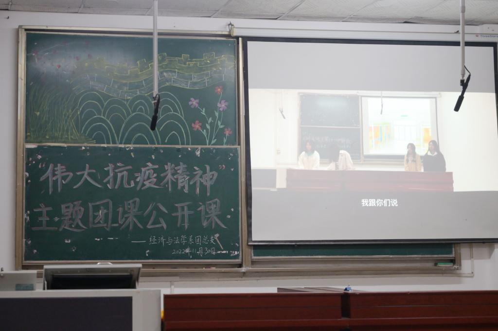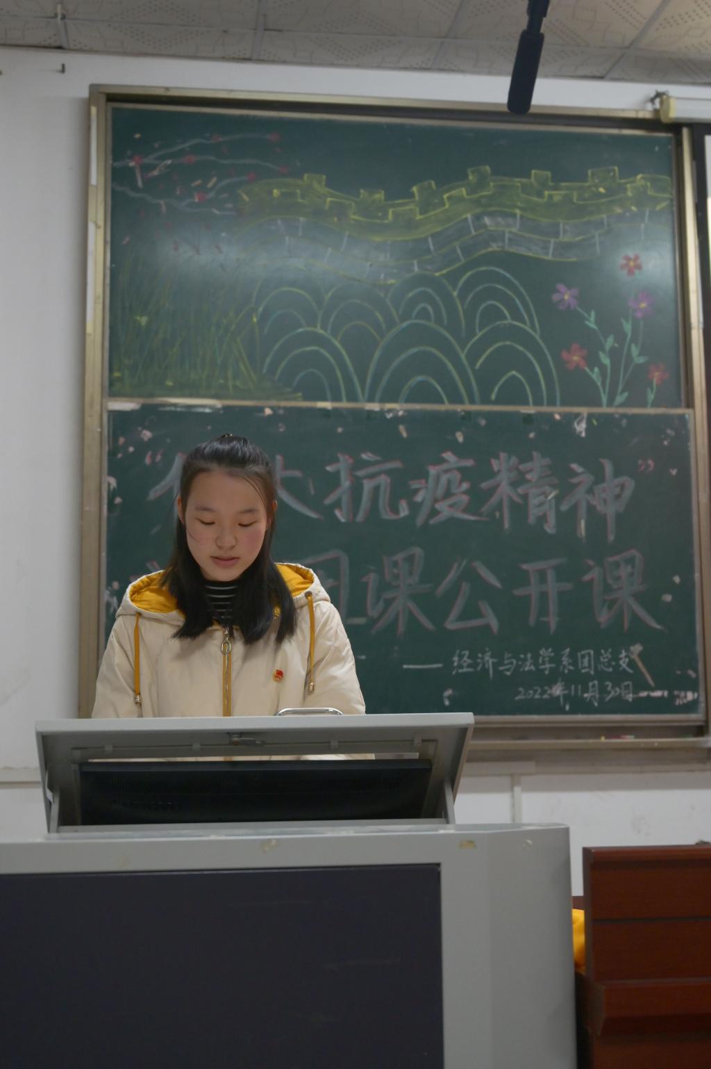 本网讯(见习记者:李欣怡 田琼钕 夏雪飞)为了弘扬我国伟大的抗疫精神,做好团课模范作用,经法系团总支于11月30日晚7时在4教300开展以“伟大抗疫精神”为主题的团课公开课。经法系党总支副书记杨杉杉老师,辅导员卢佳智老师参加本次团课。团课由组织部干事韩夏美、秘书处干事陆疆宇主持,组织部干事经济类5221班涂诗怡担任主讲人。参与本次团课的有经法系员工会全体成员以及各团支部团支书、组织宣传委员参会。