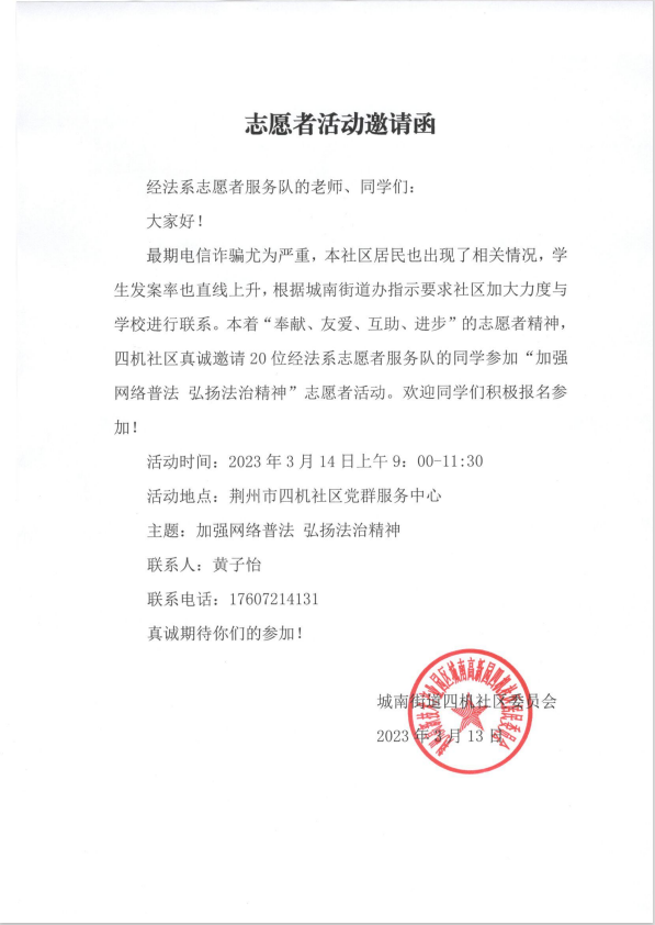 本次志愿活动志愿者们共同走近四机社区,协助社区做好普法宣传工作。在社区路上志愿者们手拿宣传册为老人宣传防诈骗知识,提高老人作为消费者的防范意识和法律意识。随后志愿者们在四机社区二楼会议室开展了普法知识讲座,为四机社区居民讲述相关法律知识和维权途径。然后跟随社区负责人入户宣传,分发普法宣传单。此次活动开展期间,经法系青年志愿者们以高昂的热情进行讲解,以认真的态度对待自己的工作,充分发扬了志愿者精神,展现了经法系员工的风采和责任担当。此次活动意义非凡,赢得了四机社区居民的一致好评。