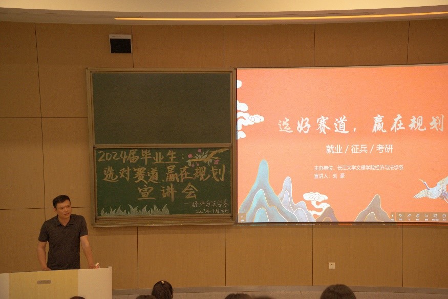 本网讯(见习记者:李欣怡 田琼钕)4月20日下午4时经济与法学系在B-213M召开“选好赛道,赢在规划”2024届毕业生宣讲会,2024届全体毕业生参加。经法系党总支书记邹姜,党总支副书记杨杉杉,辅导员卢佳智、滕宋云、刘豪莅临本次宣讲会。