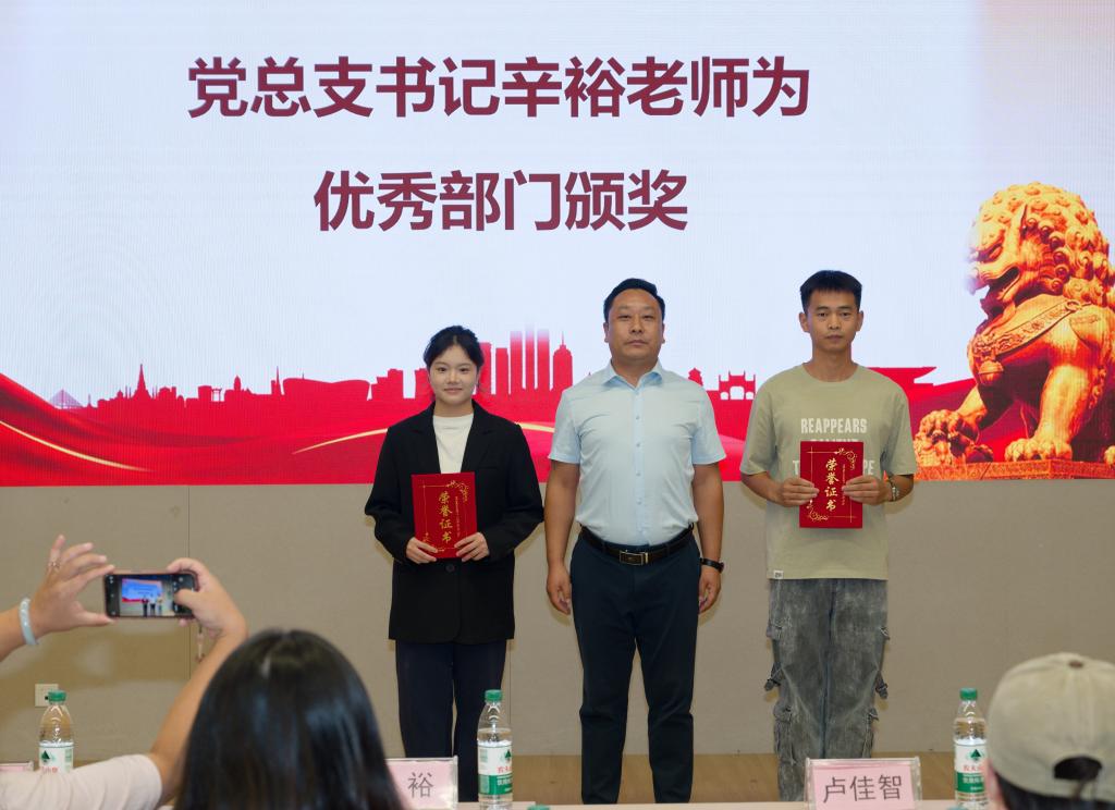 大会第一项,卢佳智宣读表彰文件并对各部门、各员工干部取得的优秀成绩予以肯定。伴随着激昂的颁奖音乐,党总支书记辛裕、党总支副书记杨杉杉上台分别为获奖部门及员工干部颁奖。