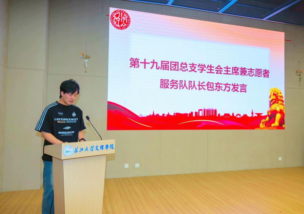 大会第三项,由第十九届团总支员工会暨志愿者服务队队长包东方上台发言。他对过去一年开展的各项工作加以总结,并且向新一届团总支员工会表达希望。他希望新一届成员们可以坚定工作信念、锻炼工作能力、培养个人素质,进而从中受益,发言最后,他对组织新成员致以真挚的鼓励和祝福。当视频播放完毕,现场响起了热烈的掌声,为过去画上圆满句号,也为未来开启新的篇章。
