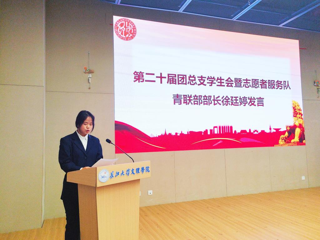 大会第四项由团总支指导老师卢佳智宣读第二十届团总支员工会暨志愿者服务队主席团任命书,团总支员工兼职副书记孙燚萌宣读了第二十届部长任命书。随后,第二十届团总支员工会暨志愿者服务队青联部部长徐廷婷上台发言,她明确提出了一系列目标,包括强化服务意识;创新工作方法;加强团队建设;注重经法系品牌建设;强化责任担当。在她的发言中,不仅有对未来新工作的期待和憧憬,更有做好每一份工作的决心和信心。
